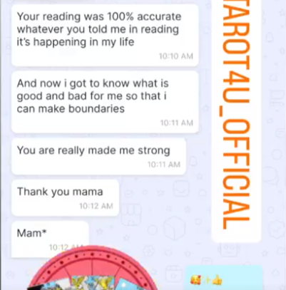 I use the symbolism and imagery on the cards to interpret messages and offer insights about the past, present, and future. I use my intuition and understanding of the cards to provide guidance on your problems.